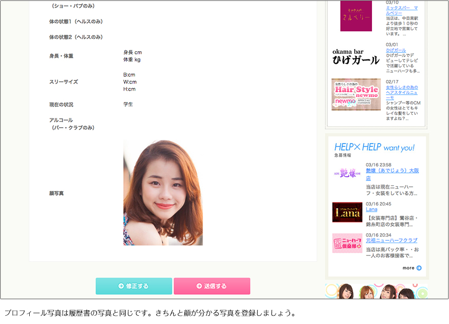 登録写真は履歴書の写真と同じです!証明写真機などで撮ったものでなくても平気ですが、男性姿の写真やグループで撮った写真やアプリなどの加工が入った写真、顔がわからないような写真は避けましょう。