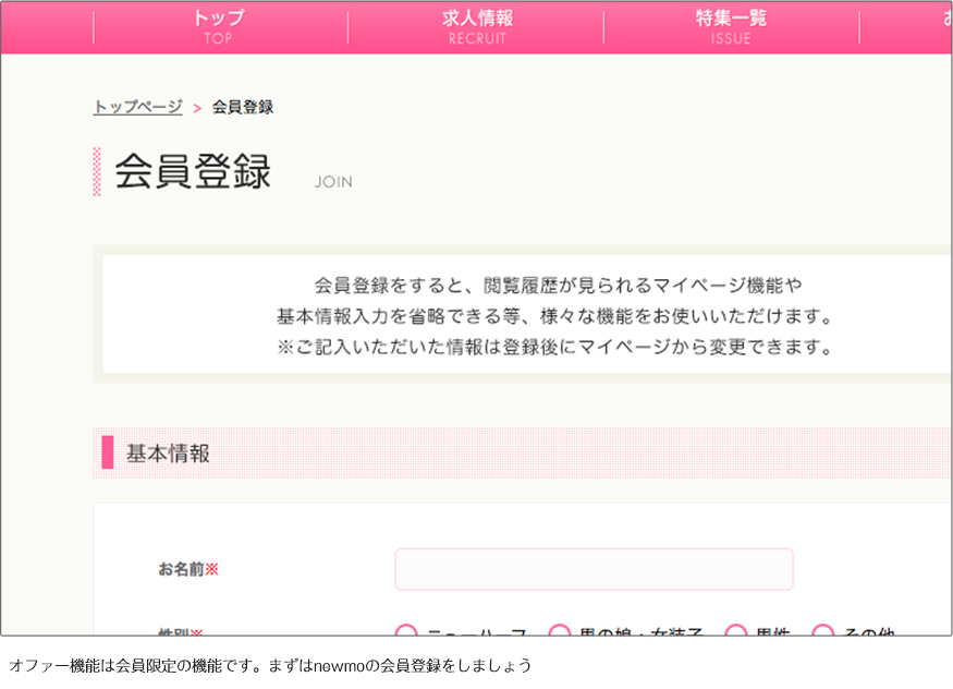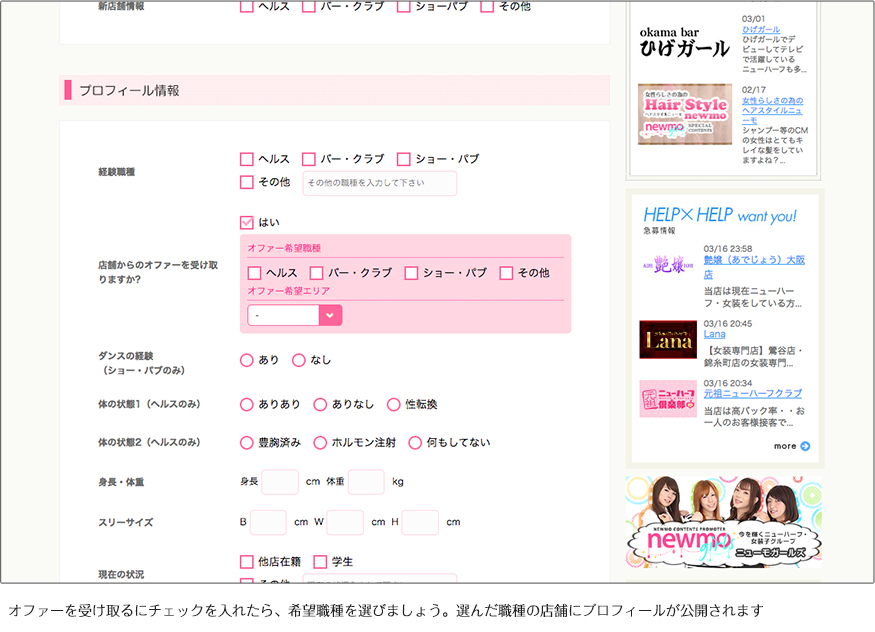 会員がオファーを受け取るにチェックし、希望職種を登録すると希望した職種の店舗にプロフィール情報の一部が公開されます。
