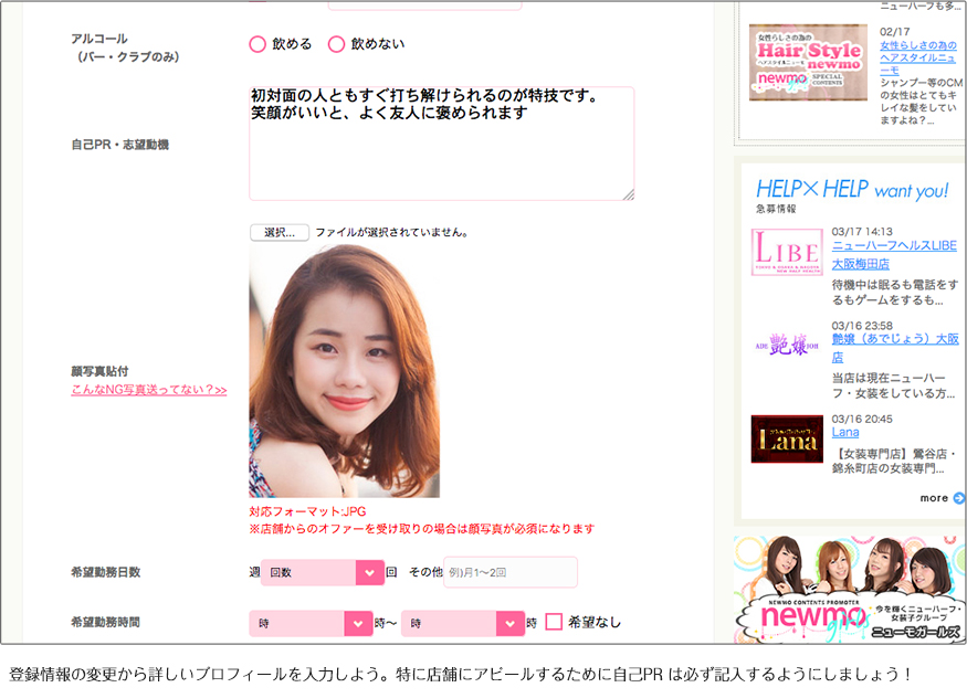 登録写真は履歴書の写真と同じです!証明写真機などで撮ったものでなくても平気ですが、男性姿の写真やグループで撮った写真やアプリなどの加工が入った写真、顔がわからないような写真は避けましょう。